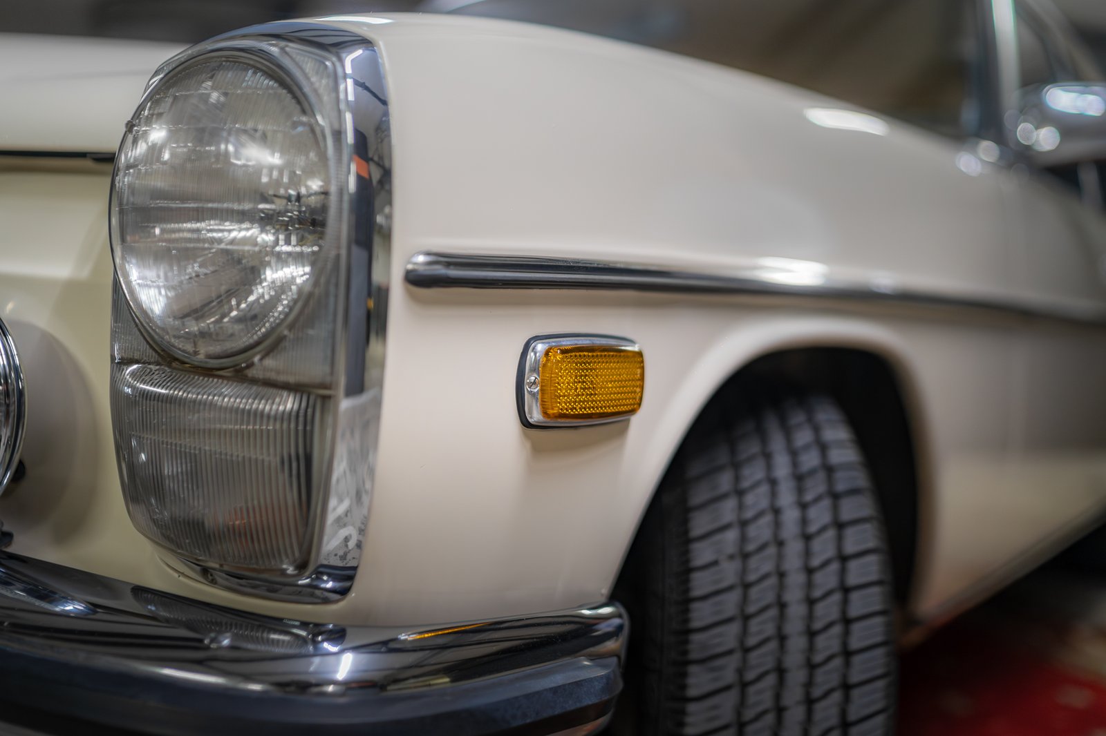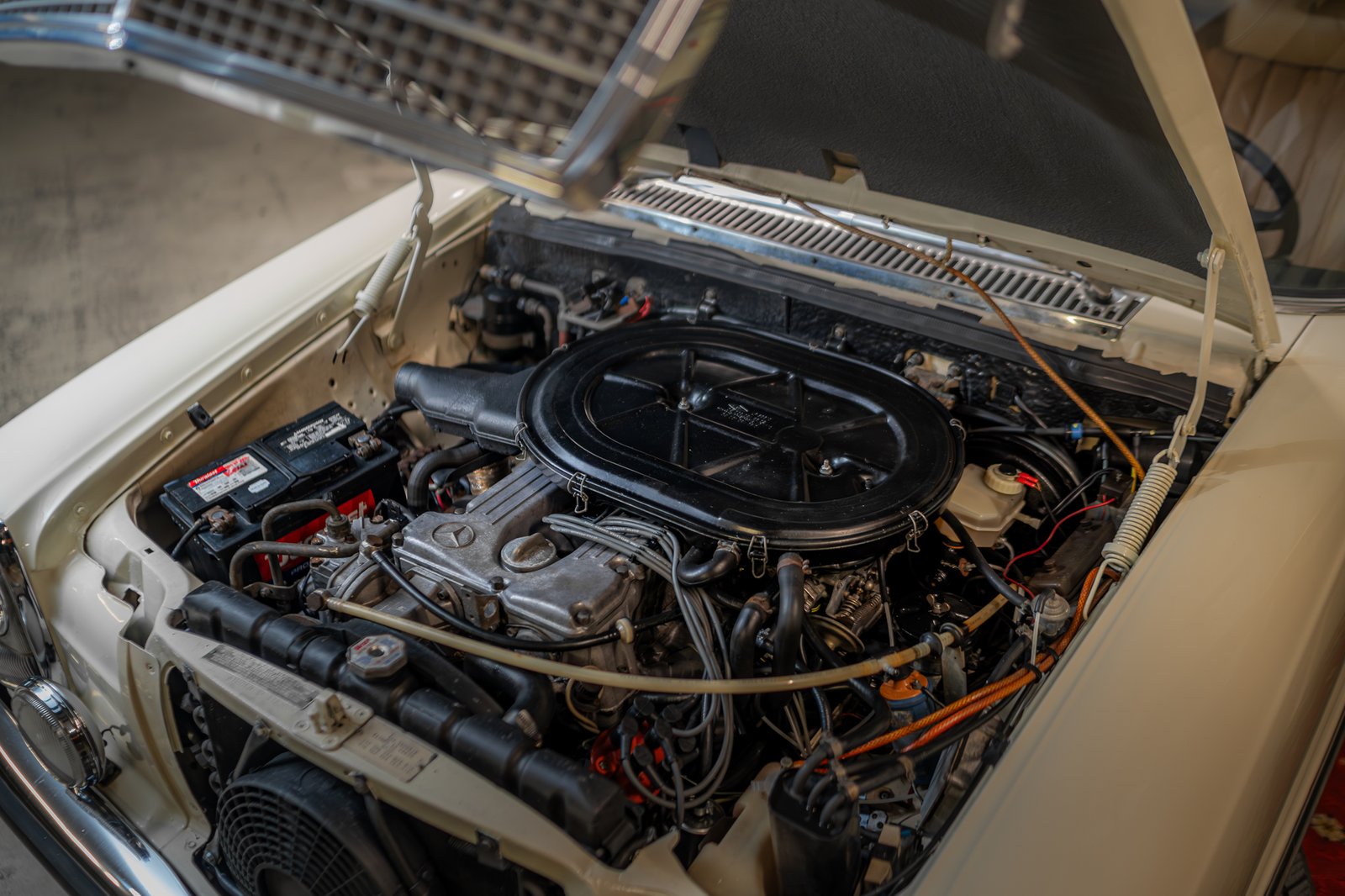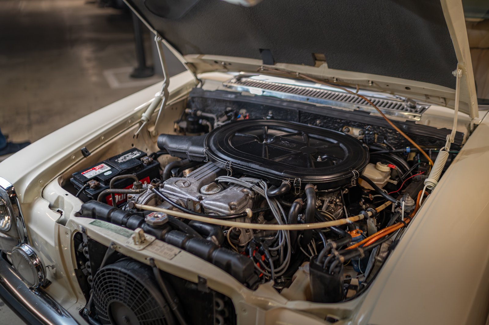 A kiállított modell egy 1975-ös, W114-es, vagyis 6 hengeres Mercedes-Benz 280-as. Az autó állapota kiváló, remekül működik. Motorja egy soros, 6 hengeres, 2,7 literes egység, amely 158 lóerő és 226 Nm leadására volt képes.